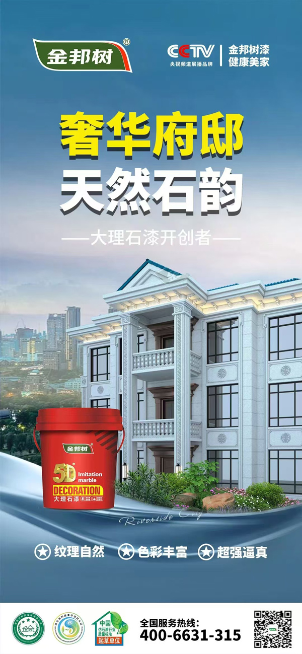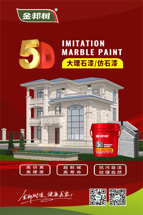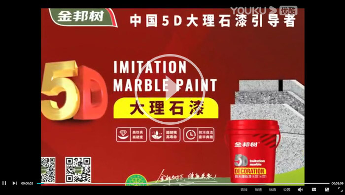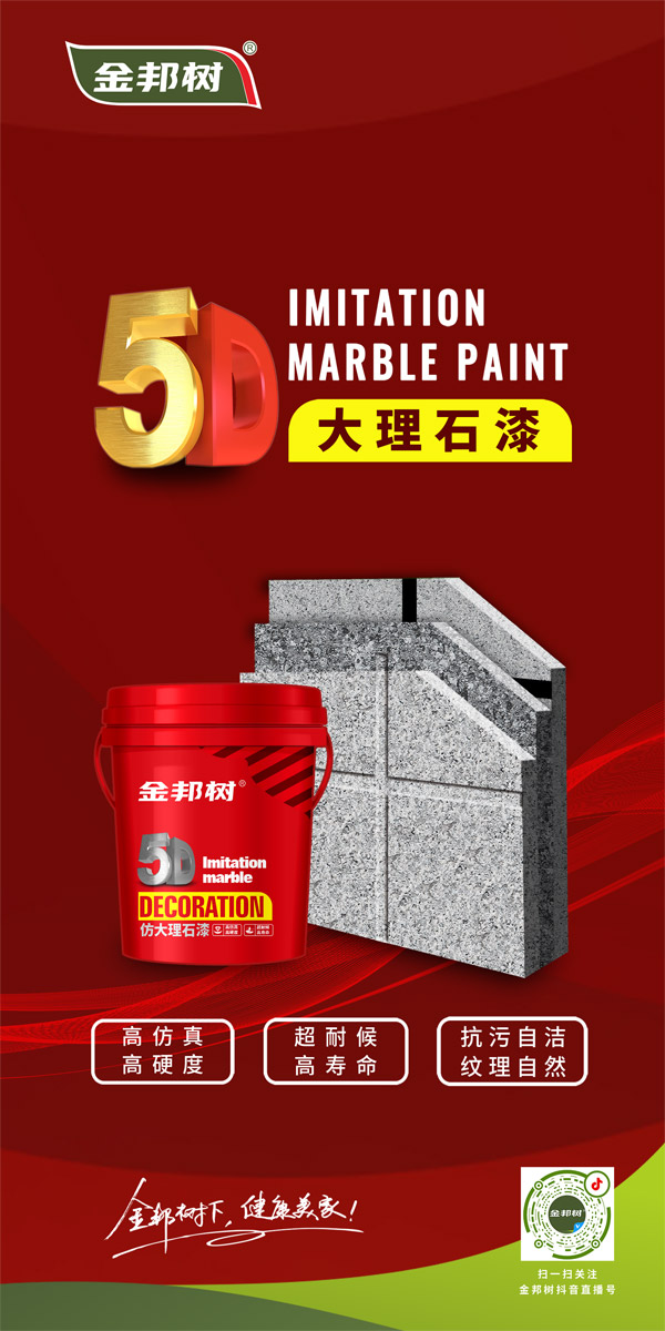 5D大理石漆 金邦树5D大理石漆采用进口彩色颗粒包裹成粒技术,材料中同时融入不相溶的多色彩的高分子胶体共聚物颗粒,形成不规则花纹的仿进口大理石纹路喝色彩,通过一次性喷涂,就可创造出几乎和原石一样的纹理效果,本产品漆乳液含量更高,高硬度、抗污性,超强超候性,能与真石材媲美。 Really stone paint 金邦树5D大理石漆宣传视频 5D大理石漆施工工艺